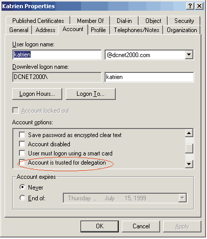 You can set delegation on each Win2K user and computer account by selecting the Account is trusted for delegation check box in an account's properties dialog box, as Screen 4 shows. You can also use the Win2K GPO Enable computer and user accounts to be trusted for delegation entry to set delegation.