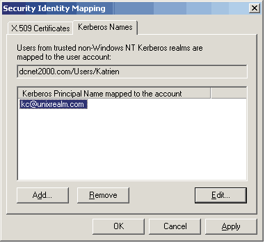 Authentication interoperability isn't simple and makes administration more complex. For example, to use a cross-realm trust to obtain authentication interoperability between Win2K and a UNIX platform, you must define an explicit mapping between each UNIX account that will access resources in your Win2K domain and a Win2K account, as Screen 5 shows. You must map each UNIX account because UNIX Kerberos account names are meaningless to Win2K domains. Windows environments use SIDs to identify accounts. UNIX accounts defined in a UNIX Kerberos domain don't have SIDs. The Security Identity Mapping dialog box shows mappings as part of a user object's advanced features.